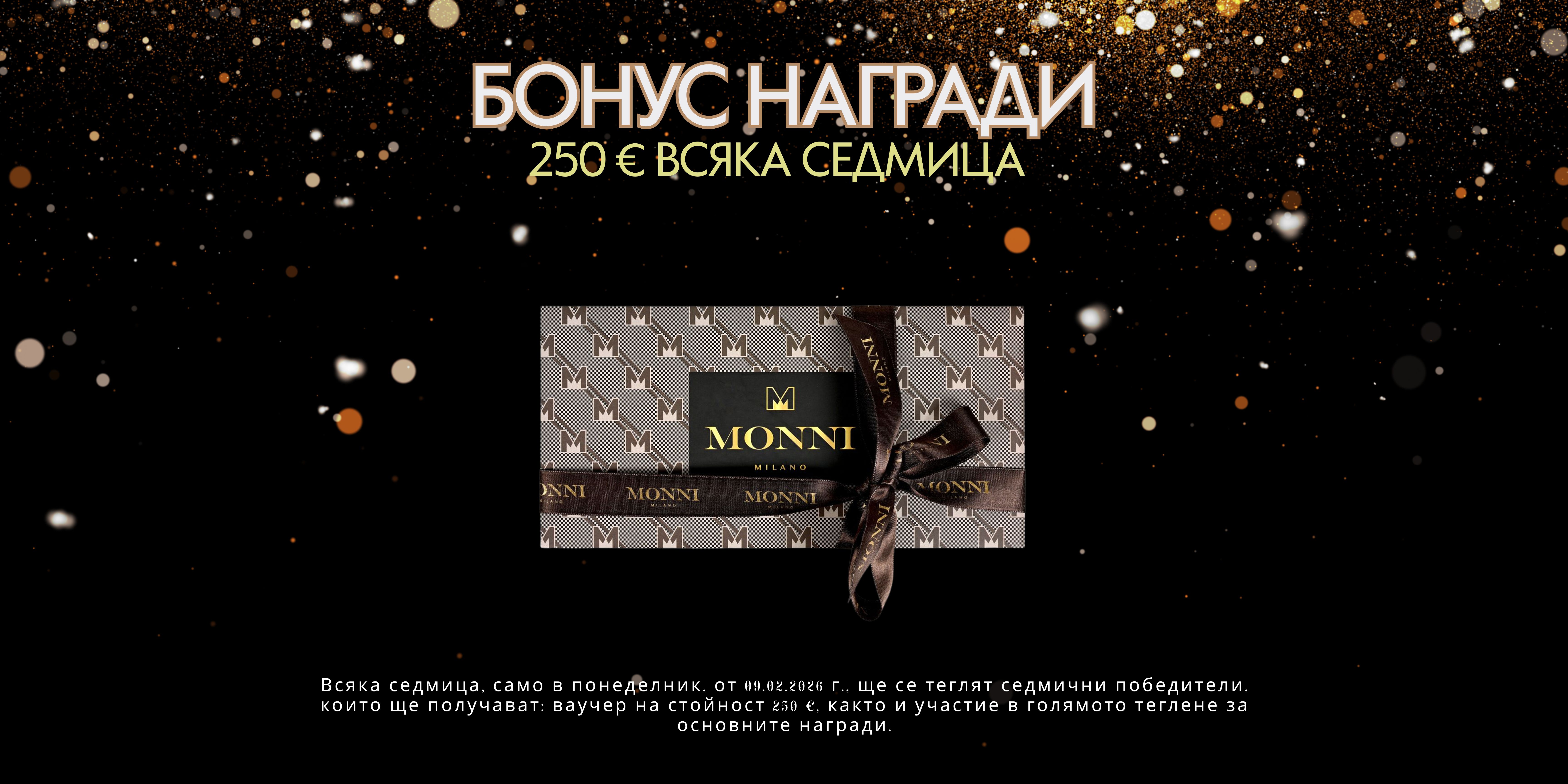 Допълнително MONNI MILANO раздава на участващите всяка седмица по 250 евро подаръчни ваучери.
