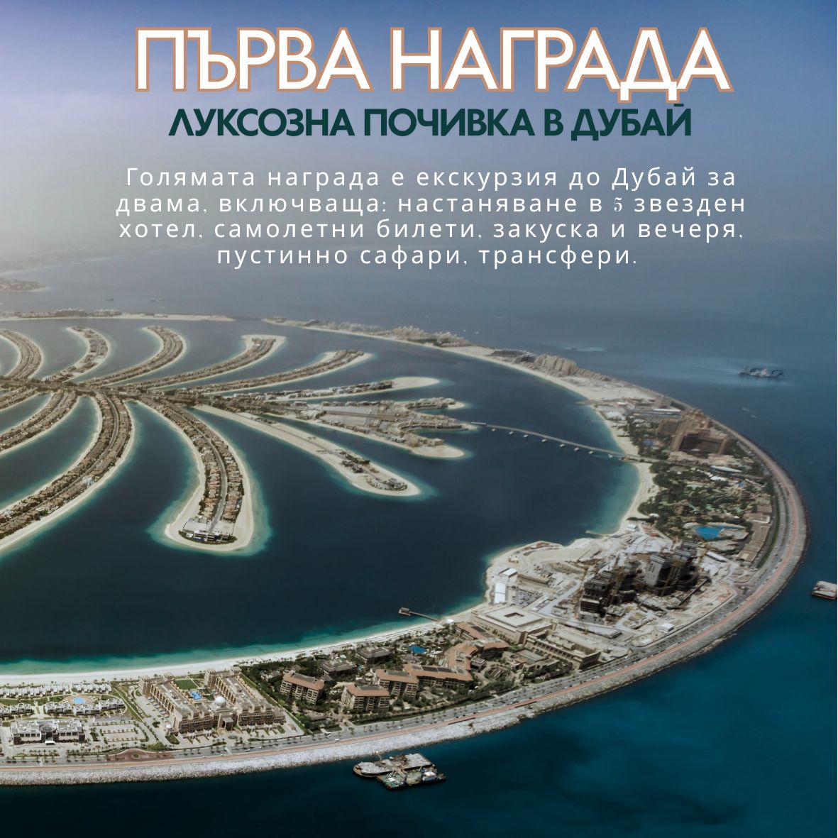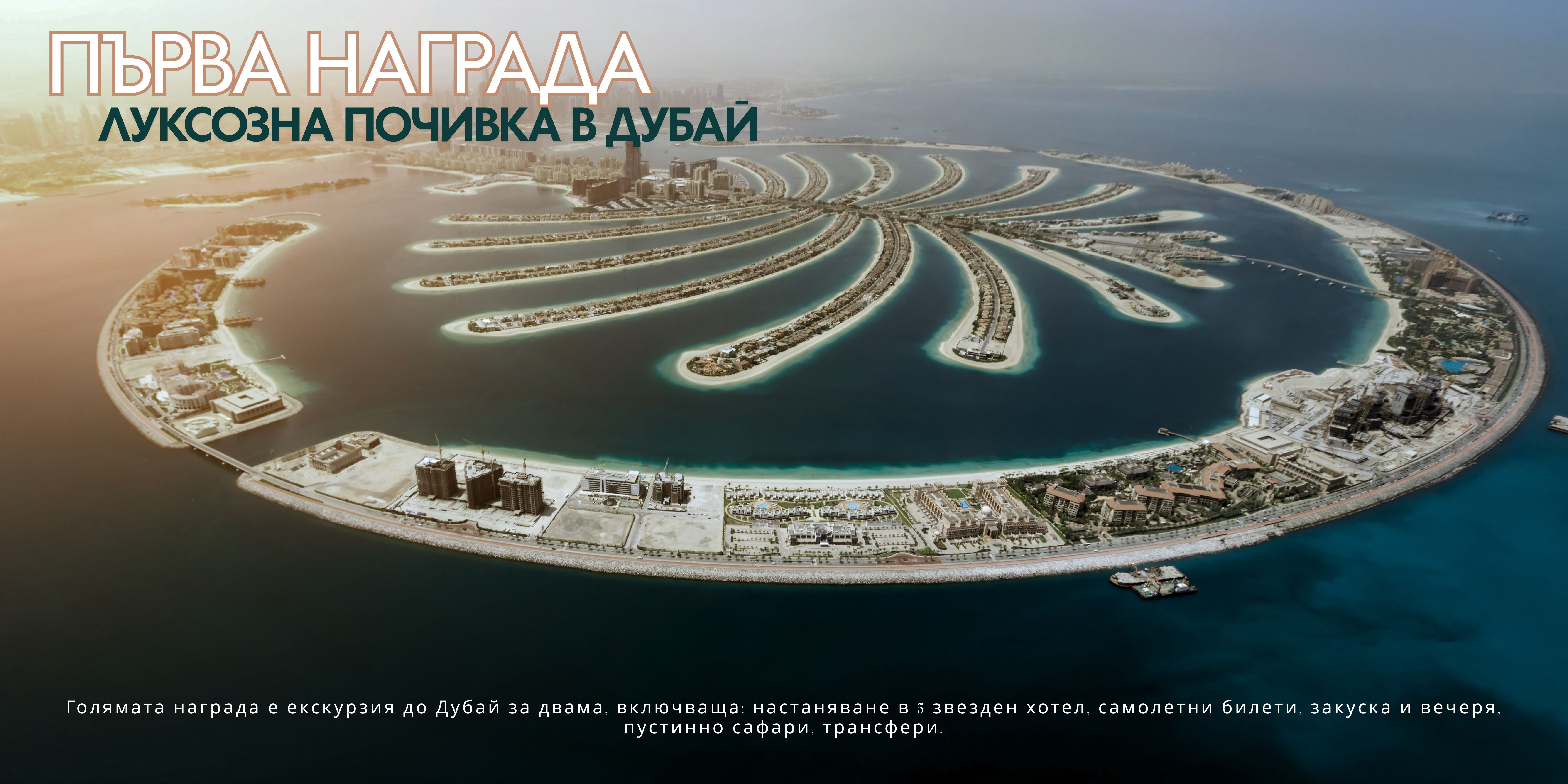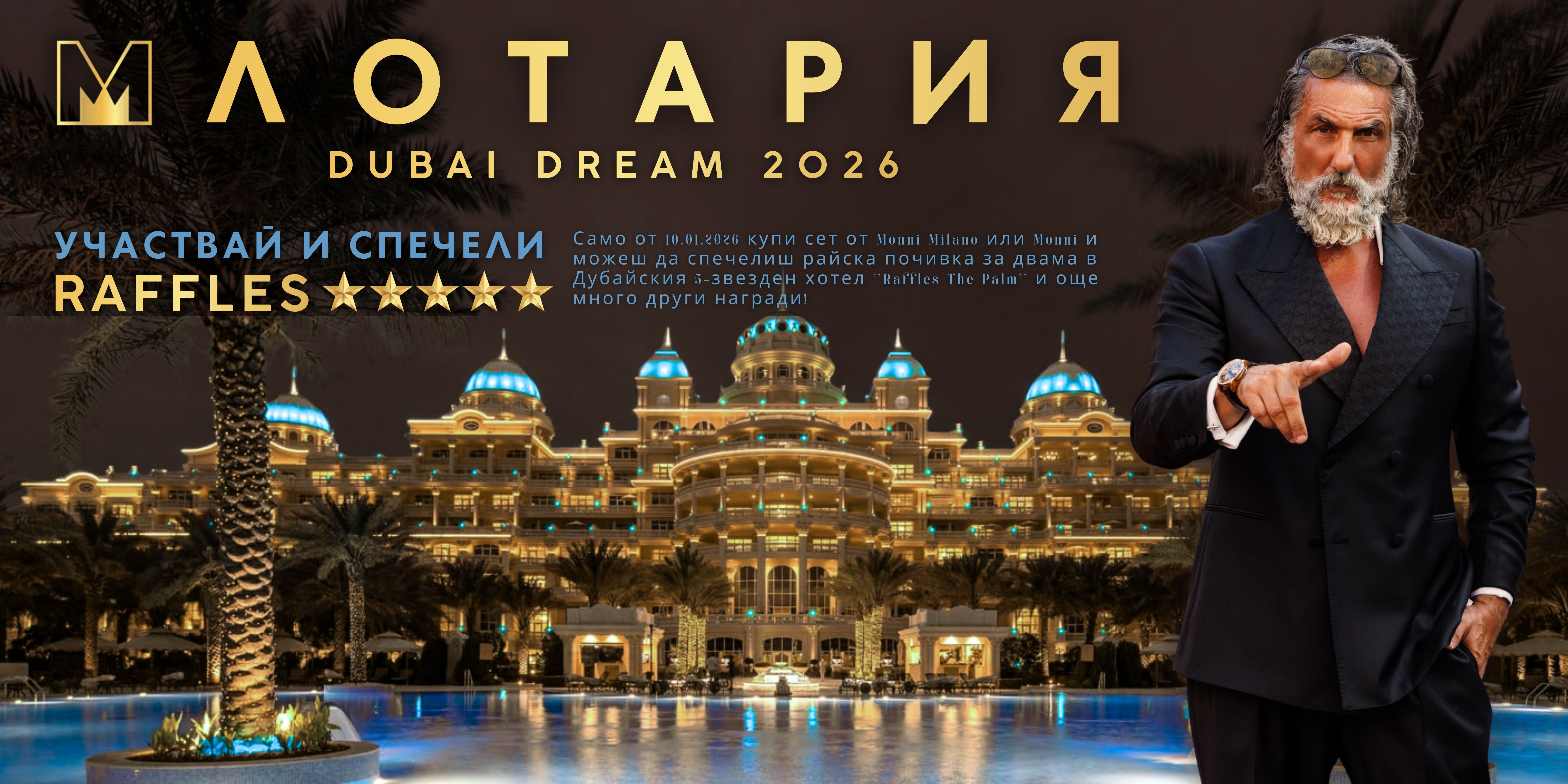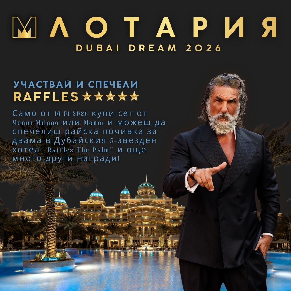 От 10.01.2026 всички, закупили цялостна визия в търговските обекти на Monni Milano и MONNI, ще имат възможност да участват в лотарията DUBAI DREAM с голямата награда 5-дневна райска почивка в DUBAI за двама в 5-звездния хотел RAFFLES THE PALM, както и 4-дневна почивка в същия хотел.