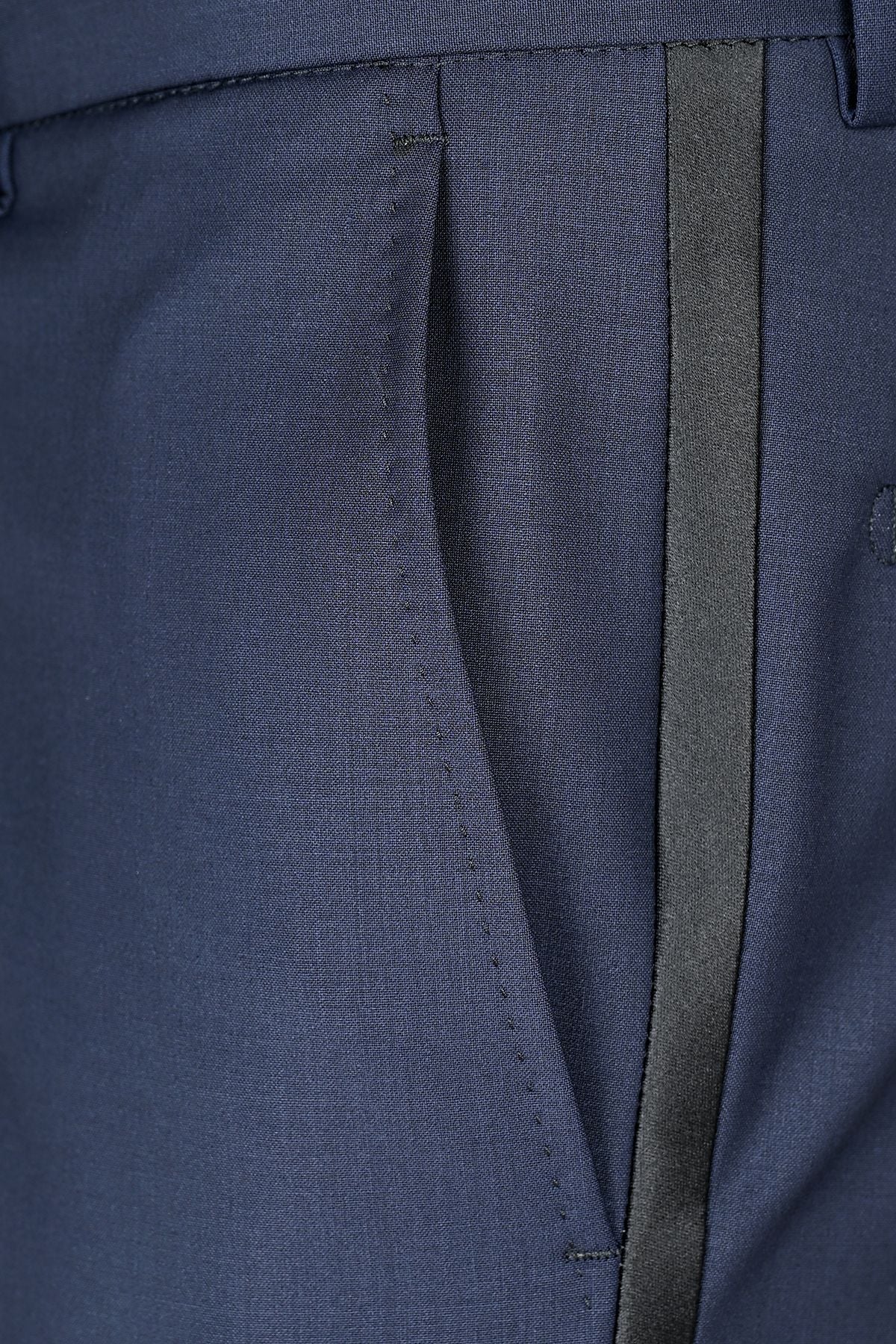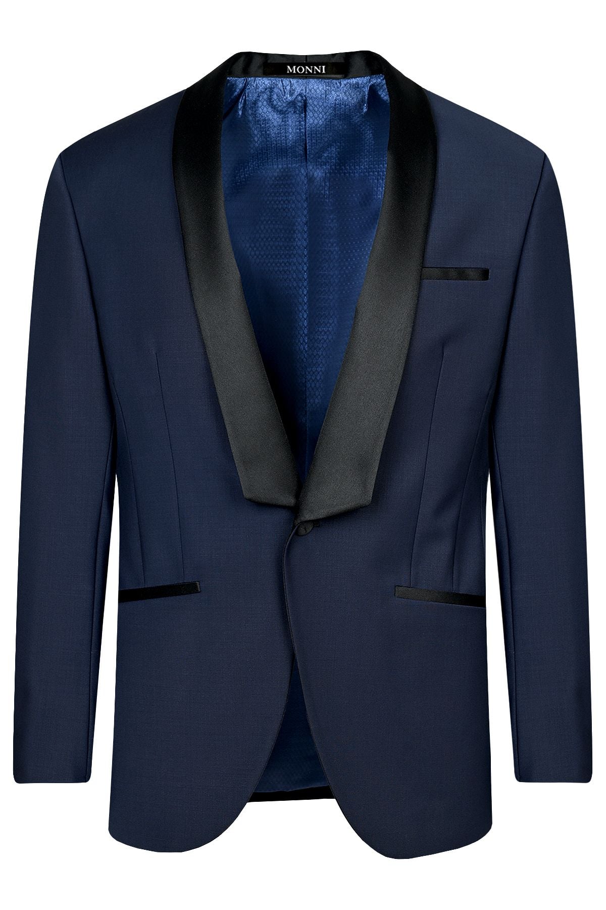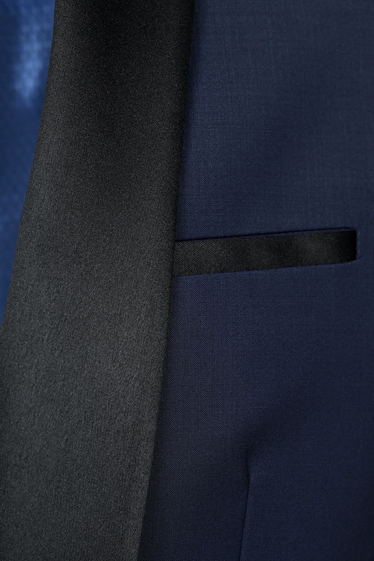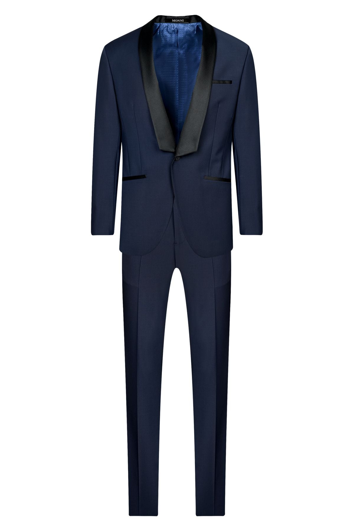 Официален костюм от вълна в тъмносин цвят с контрастен шал-ревер от сатен в черно