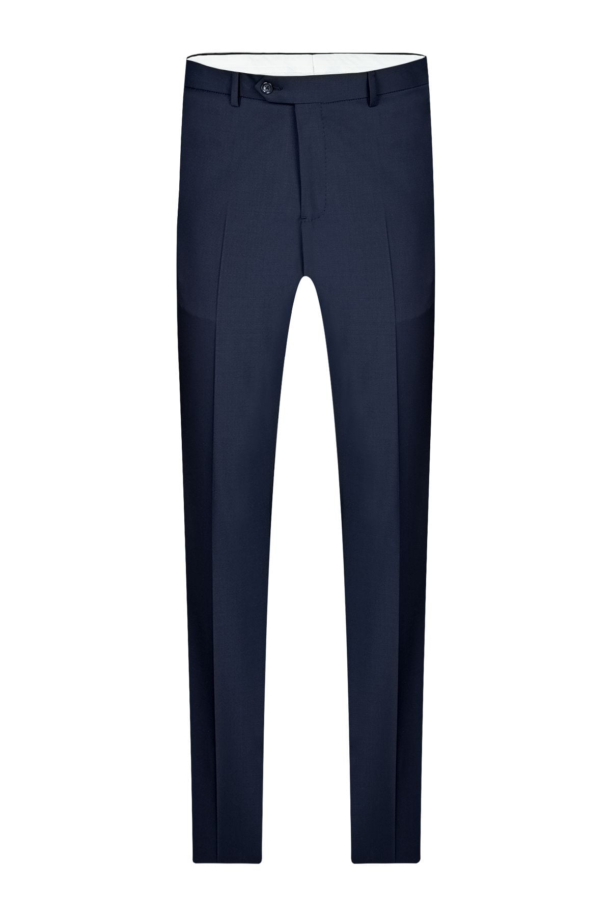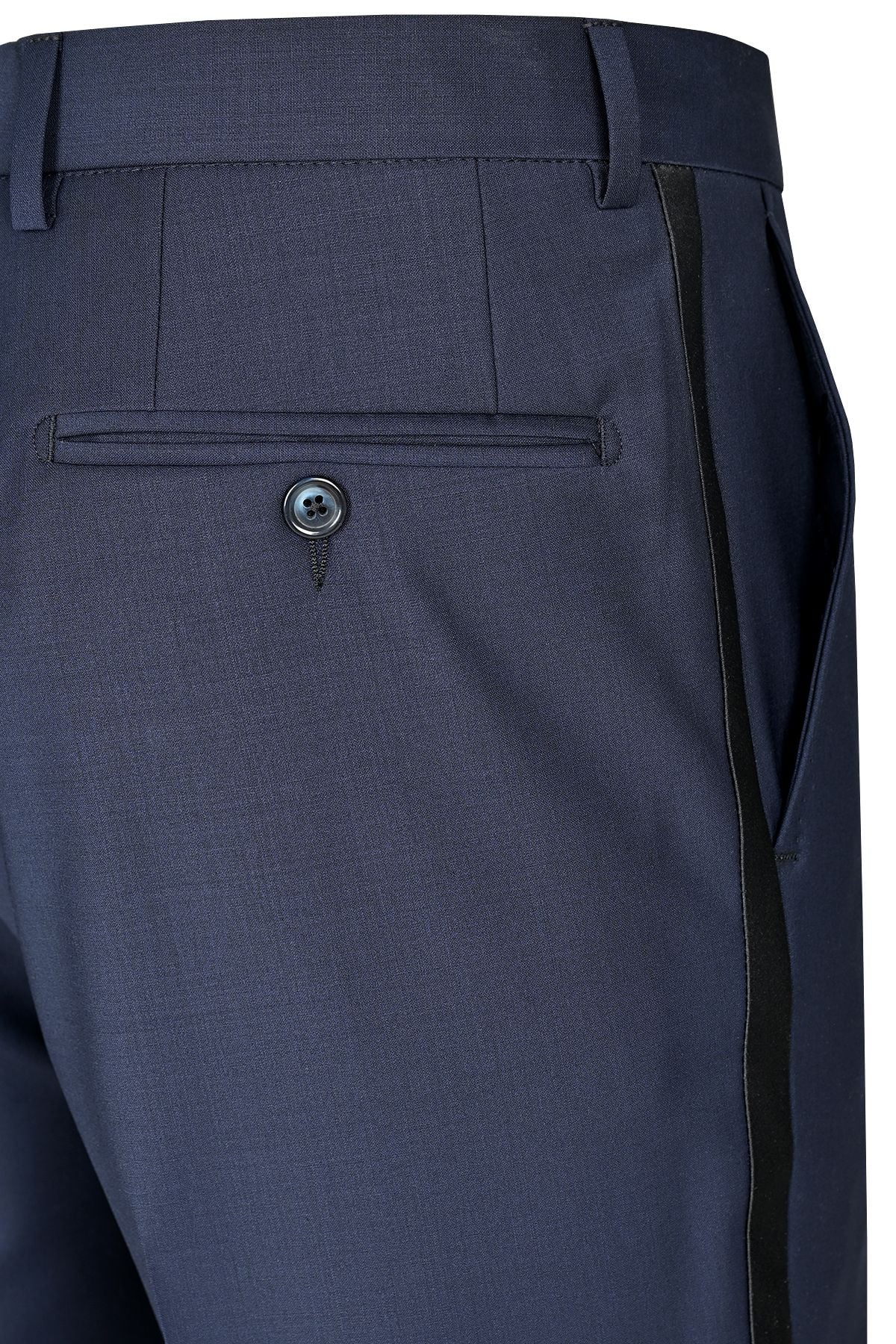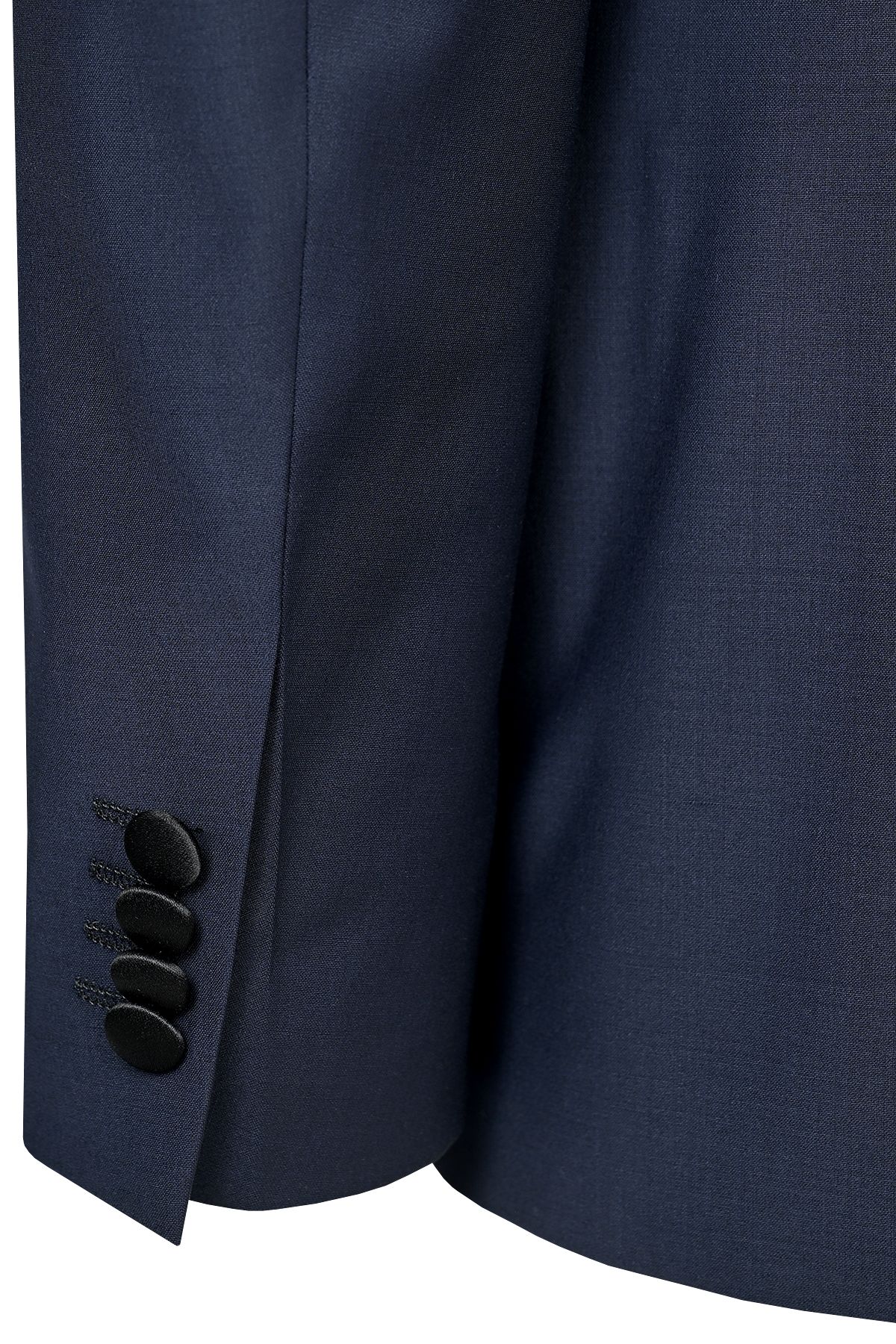 Елегантен официален костюм в тъмносин цвят с модерен силует, съчетаващ класическа визия и съвременен дизайн. Моделът се отличава с контрастен шал-ревер от сатен в черно, който придава изискан и вечерен характер. Изработен от висококачествена вълна, костюмът осигурява комфорт, отлична структура и прецизно прилягане. Завършен с изчистени линии и внимателно подбрани детайли, той е идеален избор за специални събития и официални поводи.