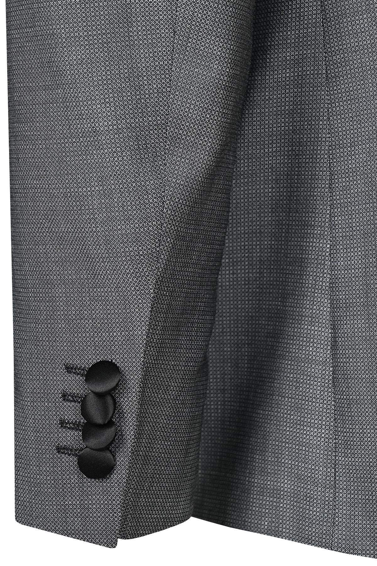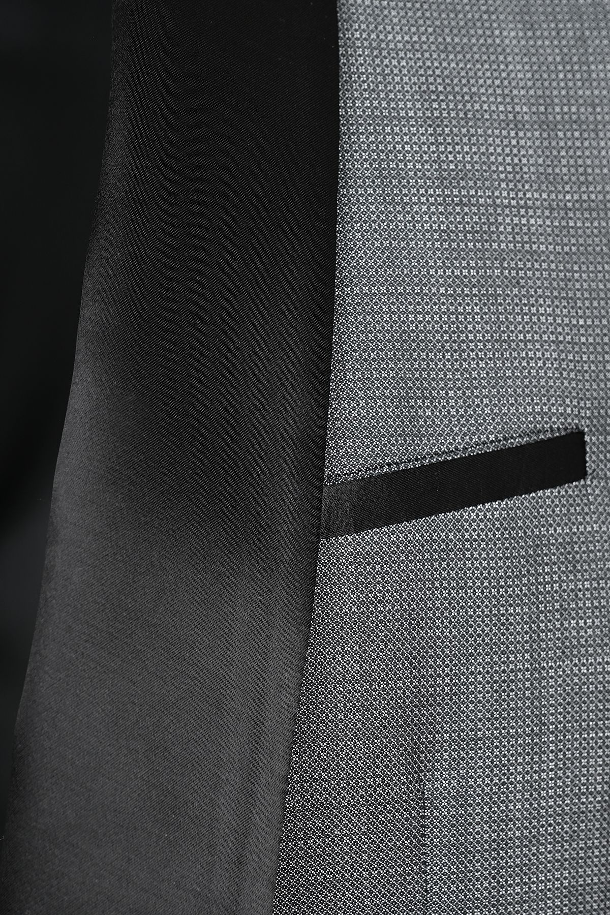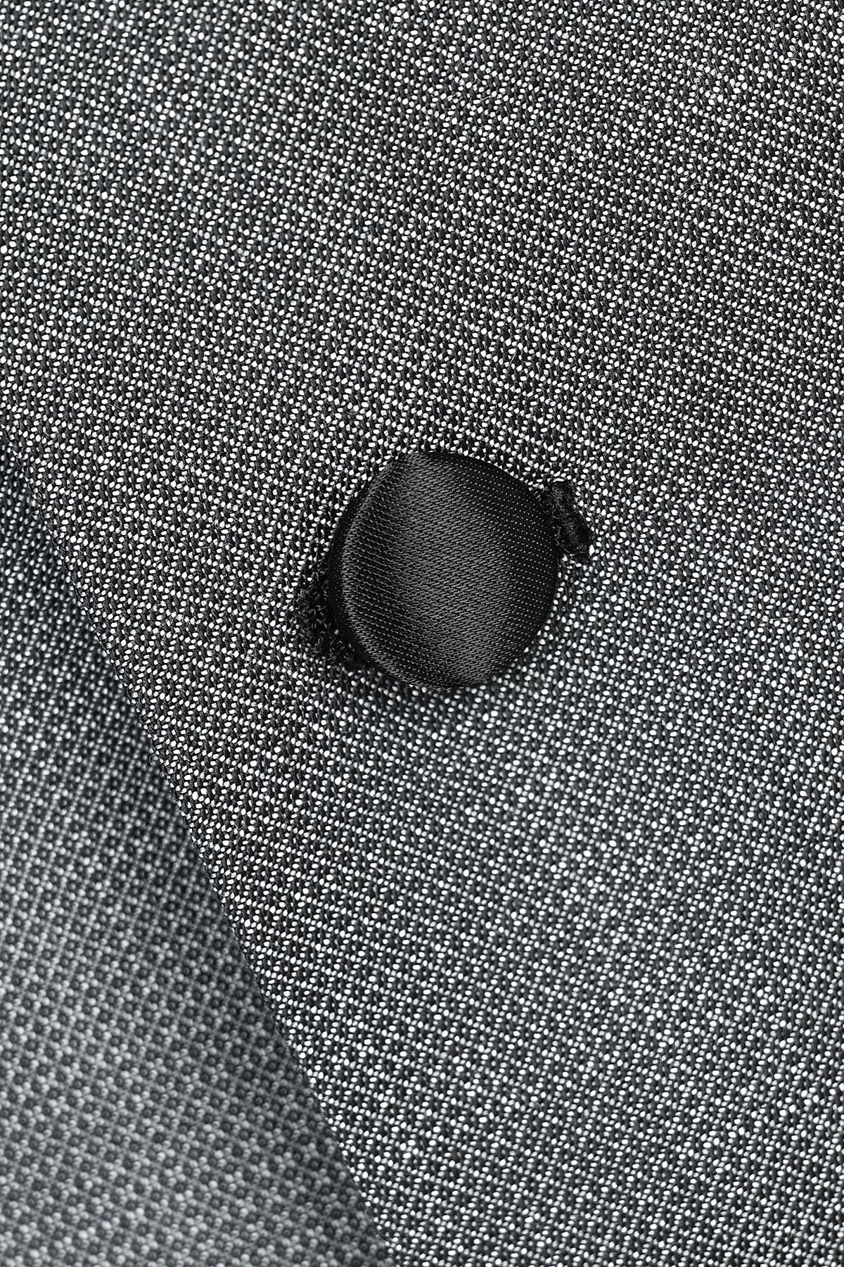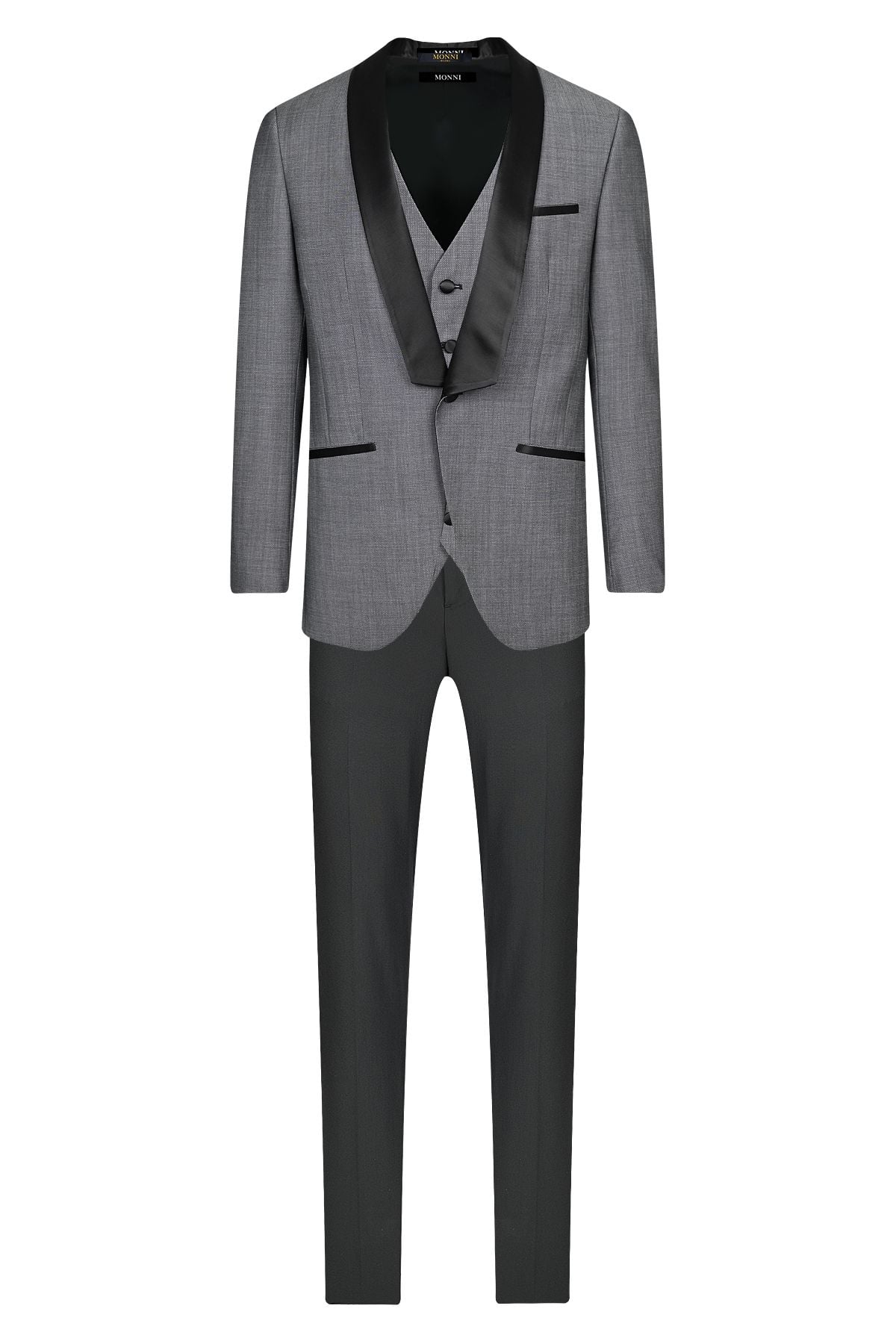 Елегантен официален костюм в сиво с модерен силует, съчетаващ класическа визия и съвременен дизайн. Моделът се отличава с контрастен шал-ревер от сатен в черно, който придава изискан и вечерен характер. Изработен от висококачествена вълна, костюмът осигурява комфорт, отлична структура и прецизно прилягане. Завършен с изчистени линии и внимателно подбрани детайли, той е идеален избор за специални събития и официални поводи.
