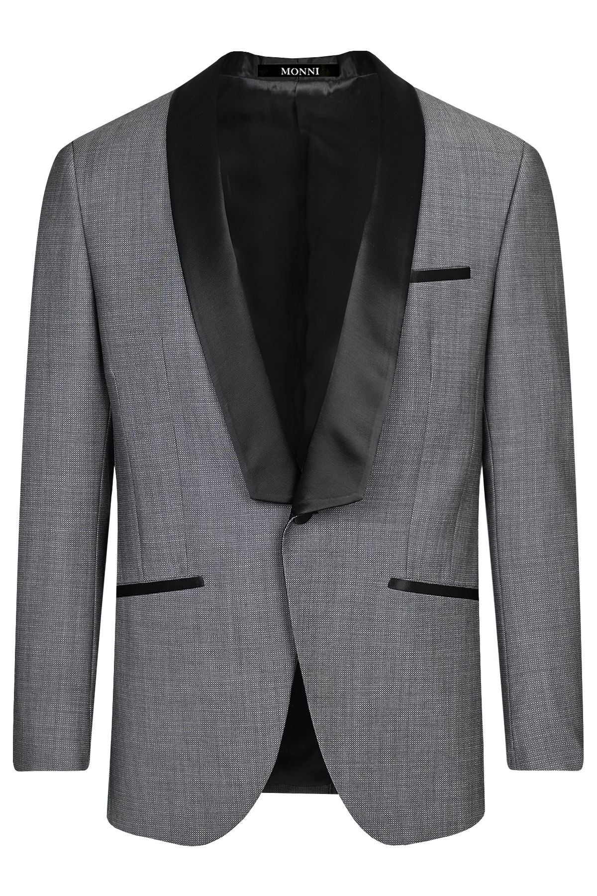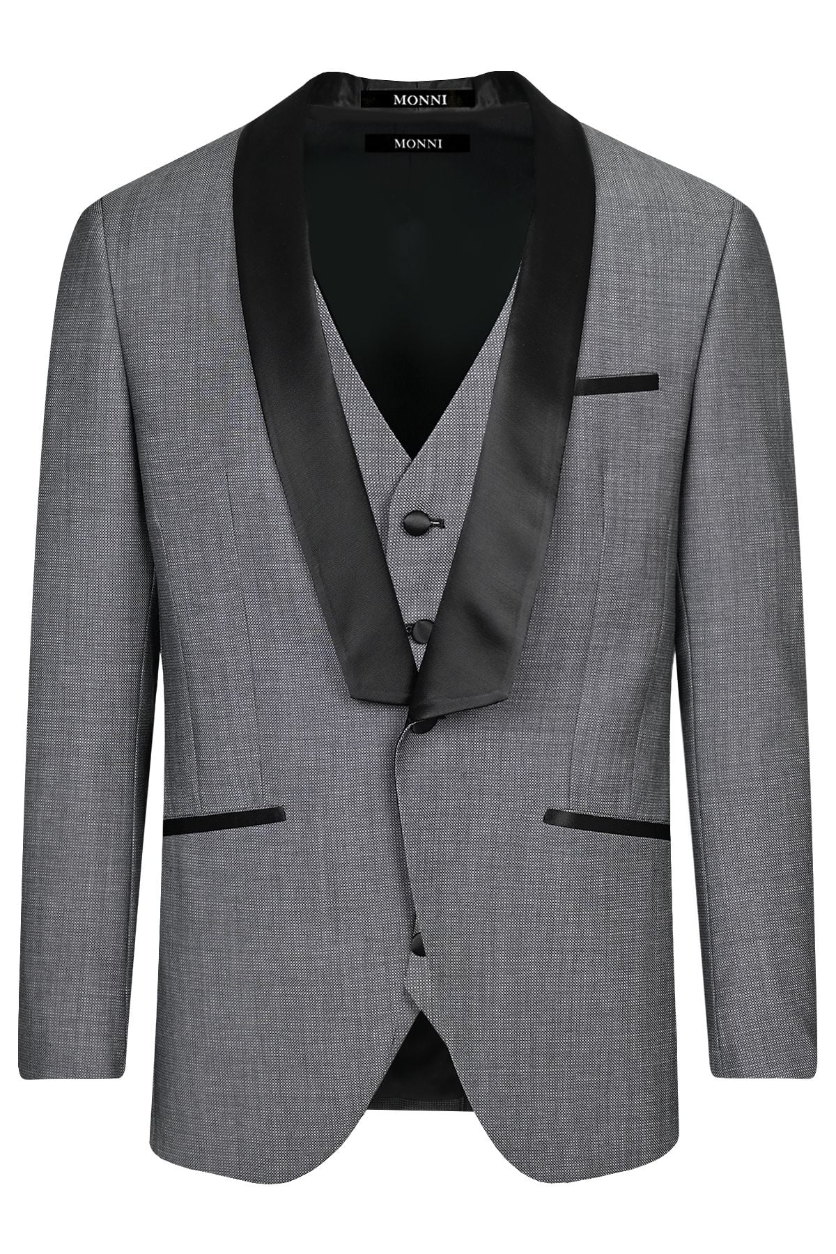 Официален костюм от вълна в сиво с контрастен шал-ревер от сатен в черно
