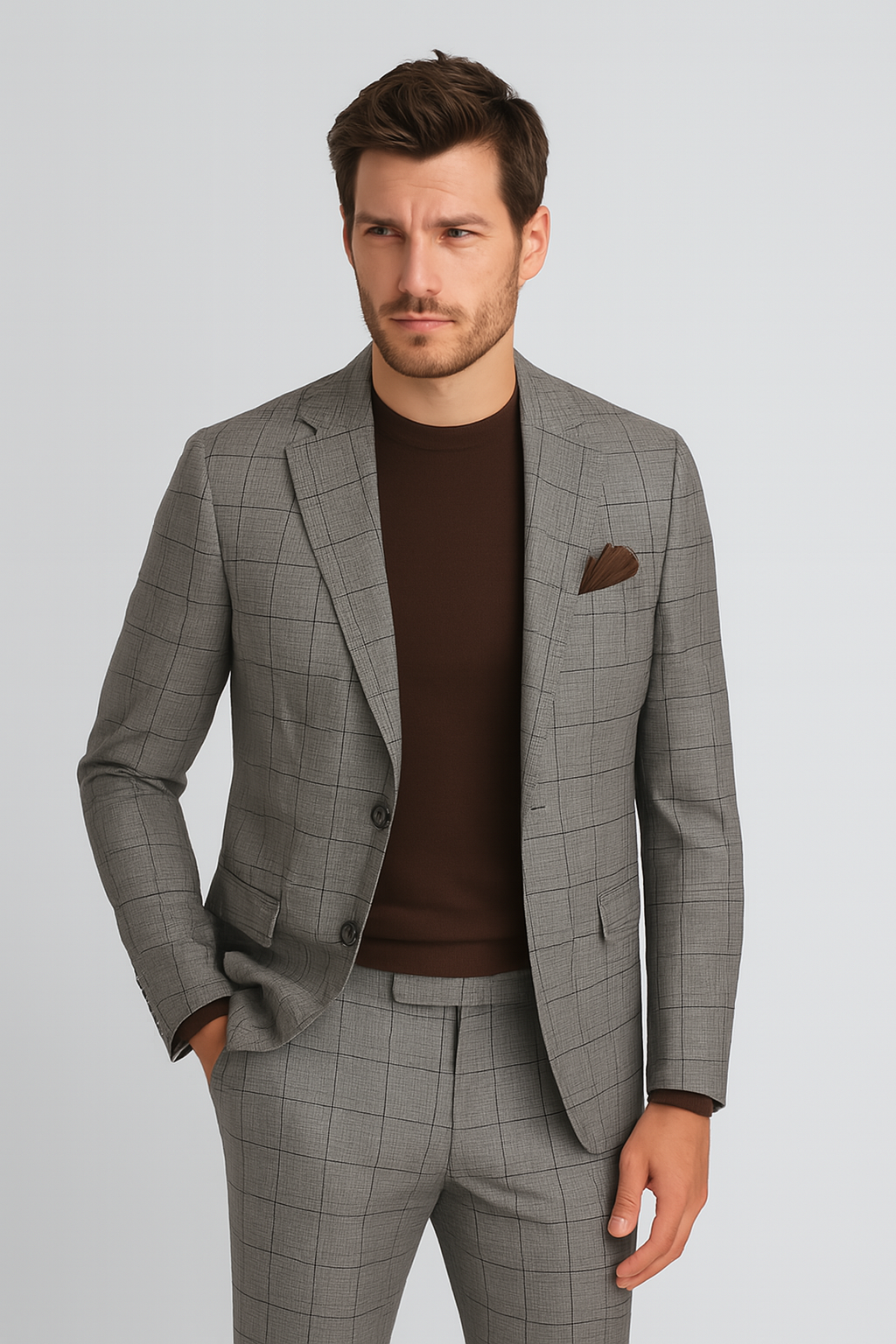 Мъжки класически костюм от вълна в тъмносиво каре