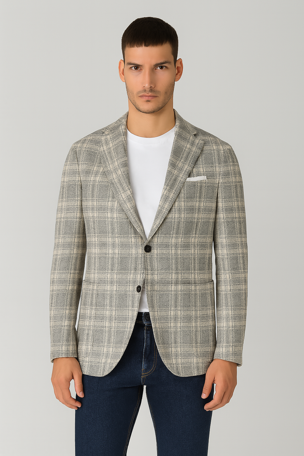 Мъжко карирано сако тип жилетка от елегантен памучен плат в сиво