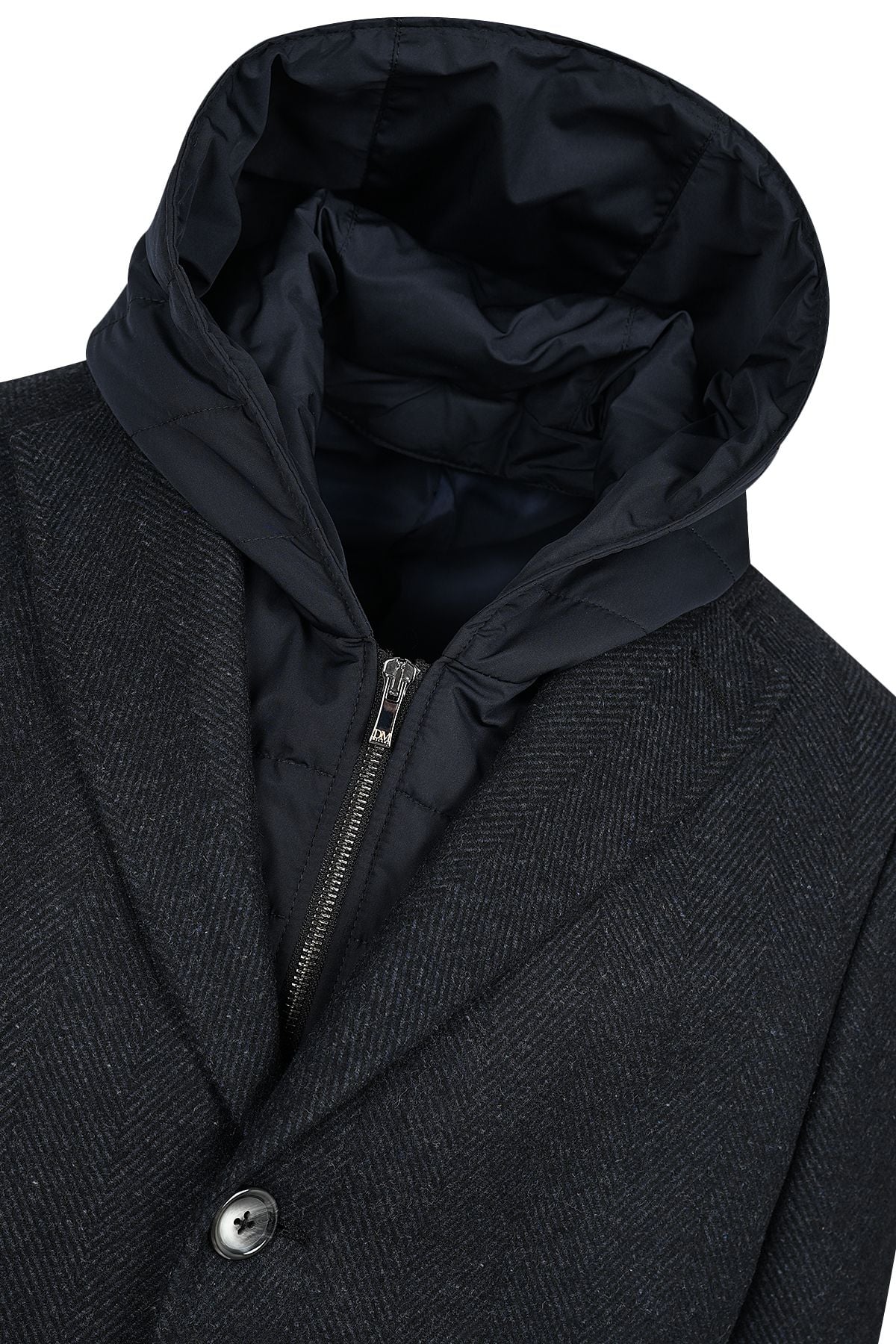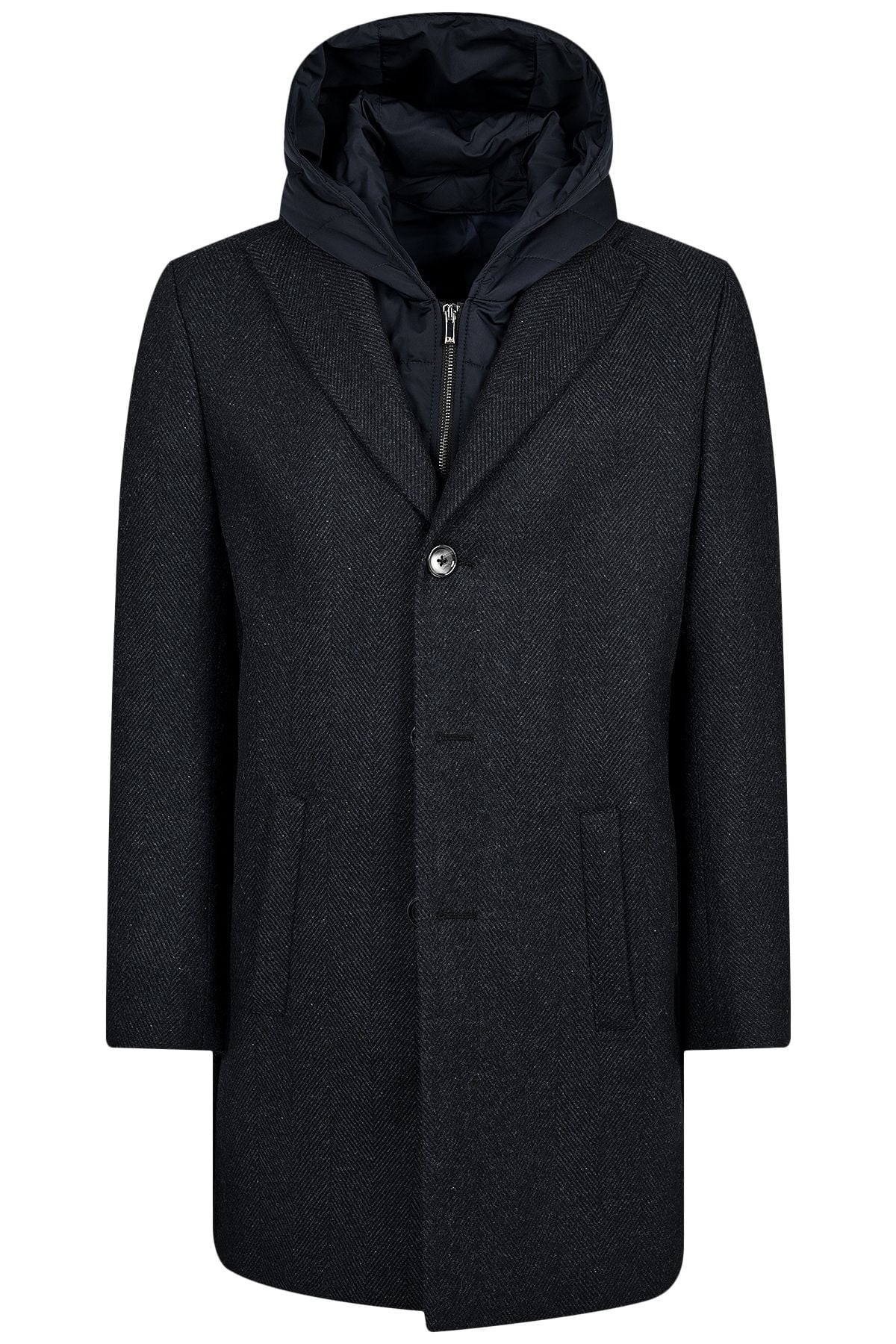 Мъжко класическо палто с петорина и качулка в тъмносиньо