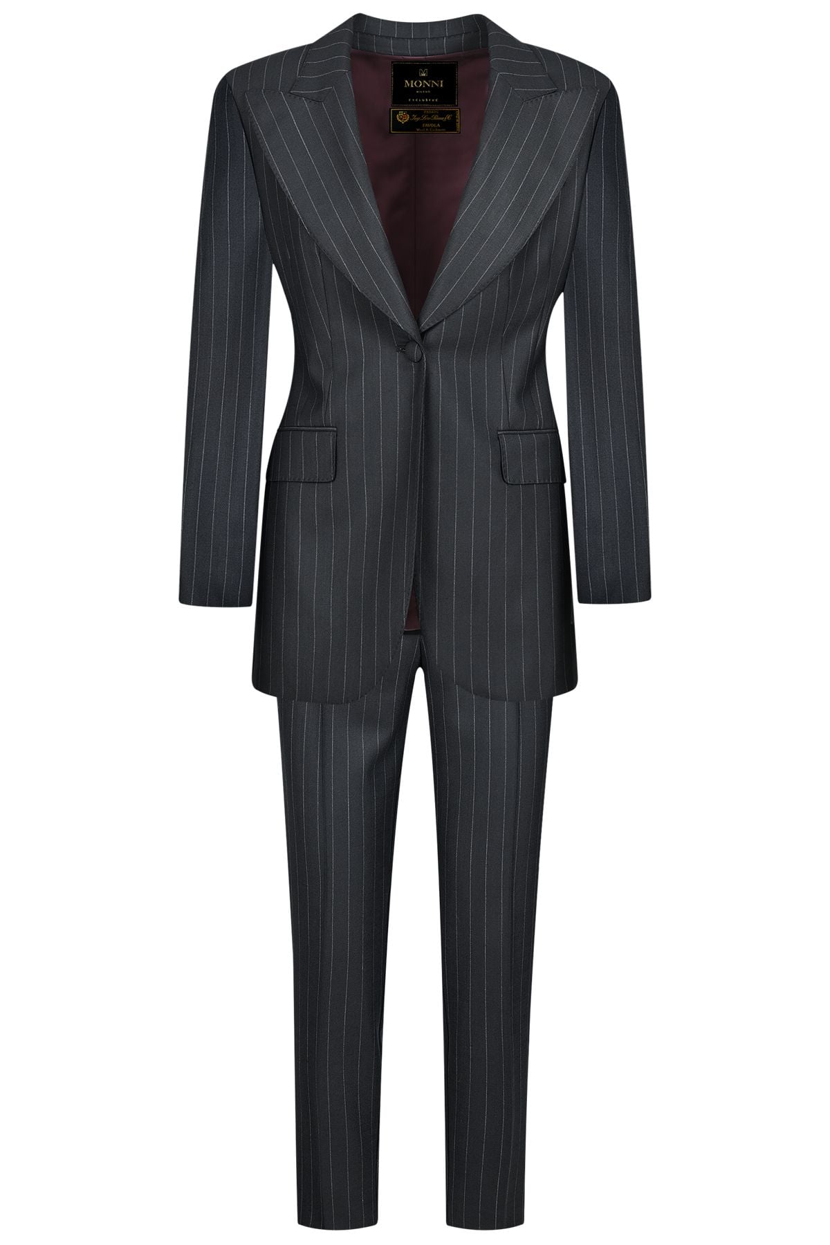 Дамският костюм е елегантен с прибрана издължена кройка, остър ревер и едноредно закопчаване.