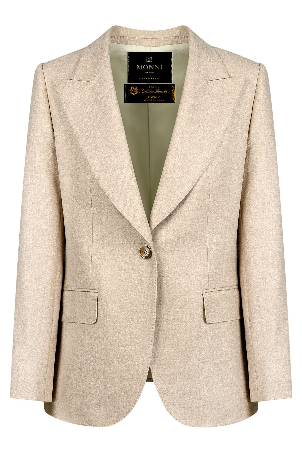 - Сакото е с едноредно закопчаване, остър ревер и оформени рамена .