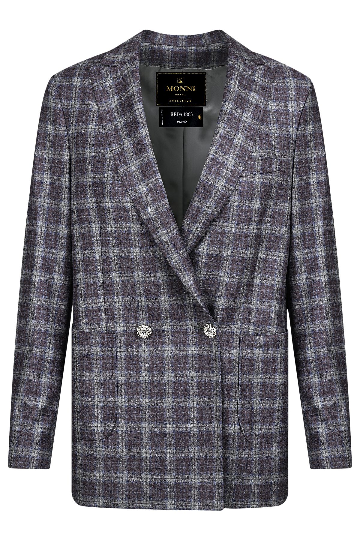 - Олекотено вълнено дамско сако с двуредно закопчаване и външни джобове.