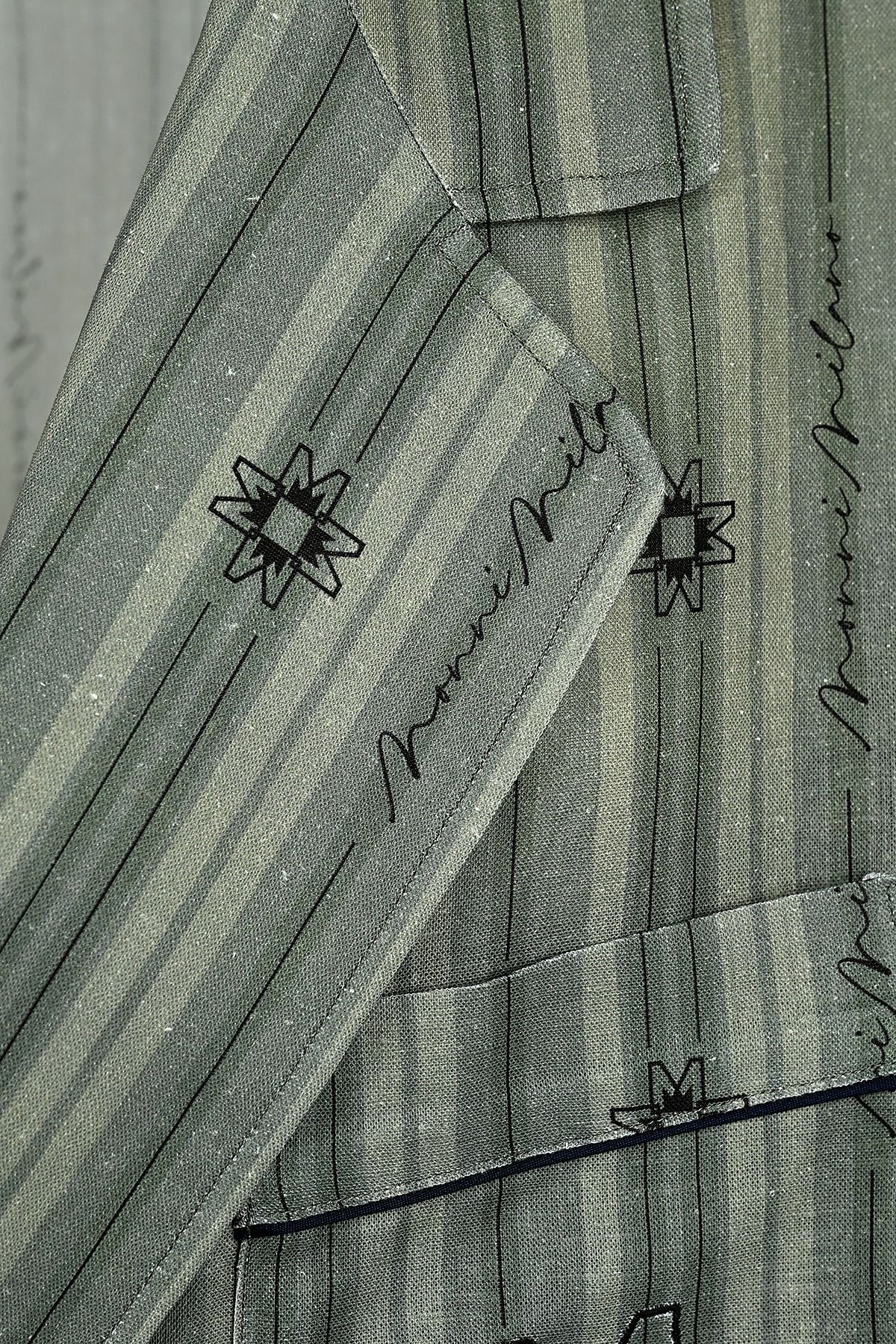 - Дизайнът на принта на плата е на райета, комбиниран със имволите, логото, името и подписа на марката.