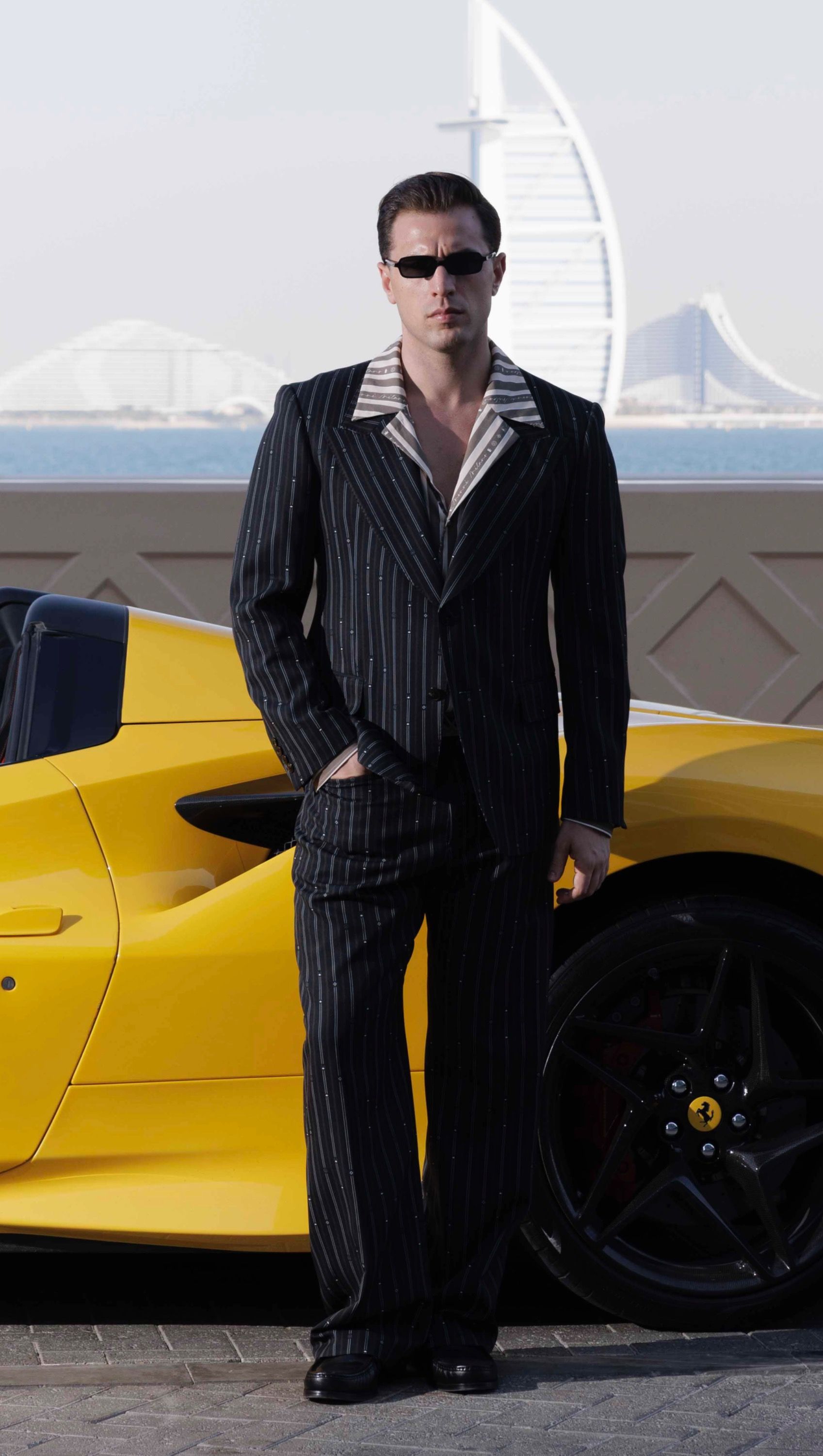 - Сакото се комбинира с принтирана риза с голяма и модерна яка върху ревера на сакото, панталон със същия дизайн от колекцията Trend и мокасини от естествена кожа.