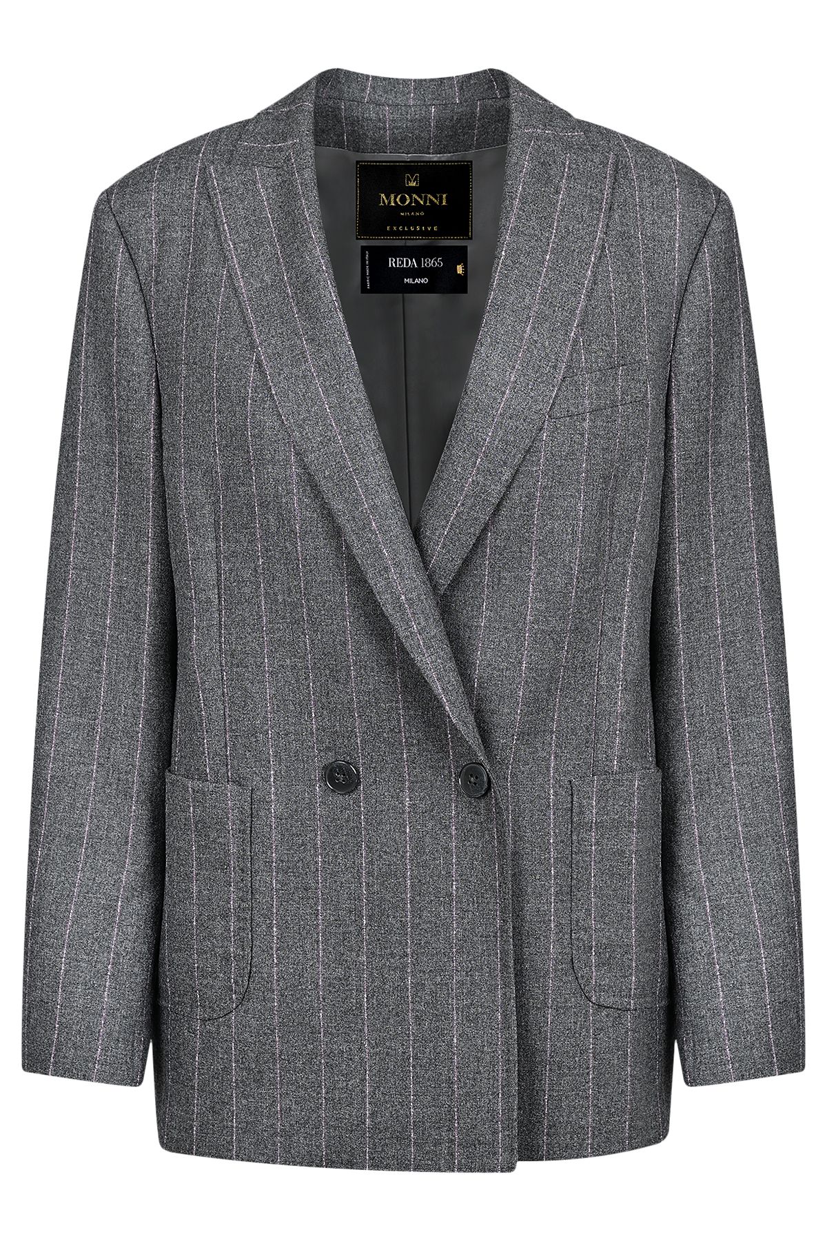 - Дамско сако в свободна конструкция с двуредно закопчаване и външни джобове.