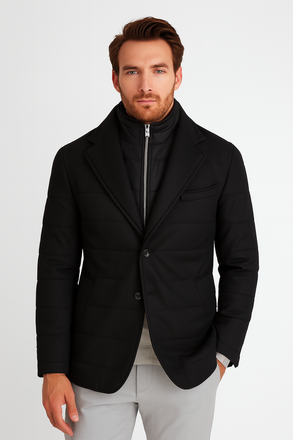 Мъжко яке в черно от промозана вълна с петорина и капитонаж