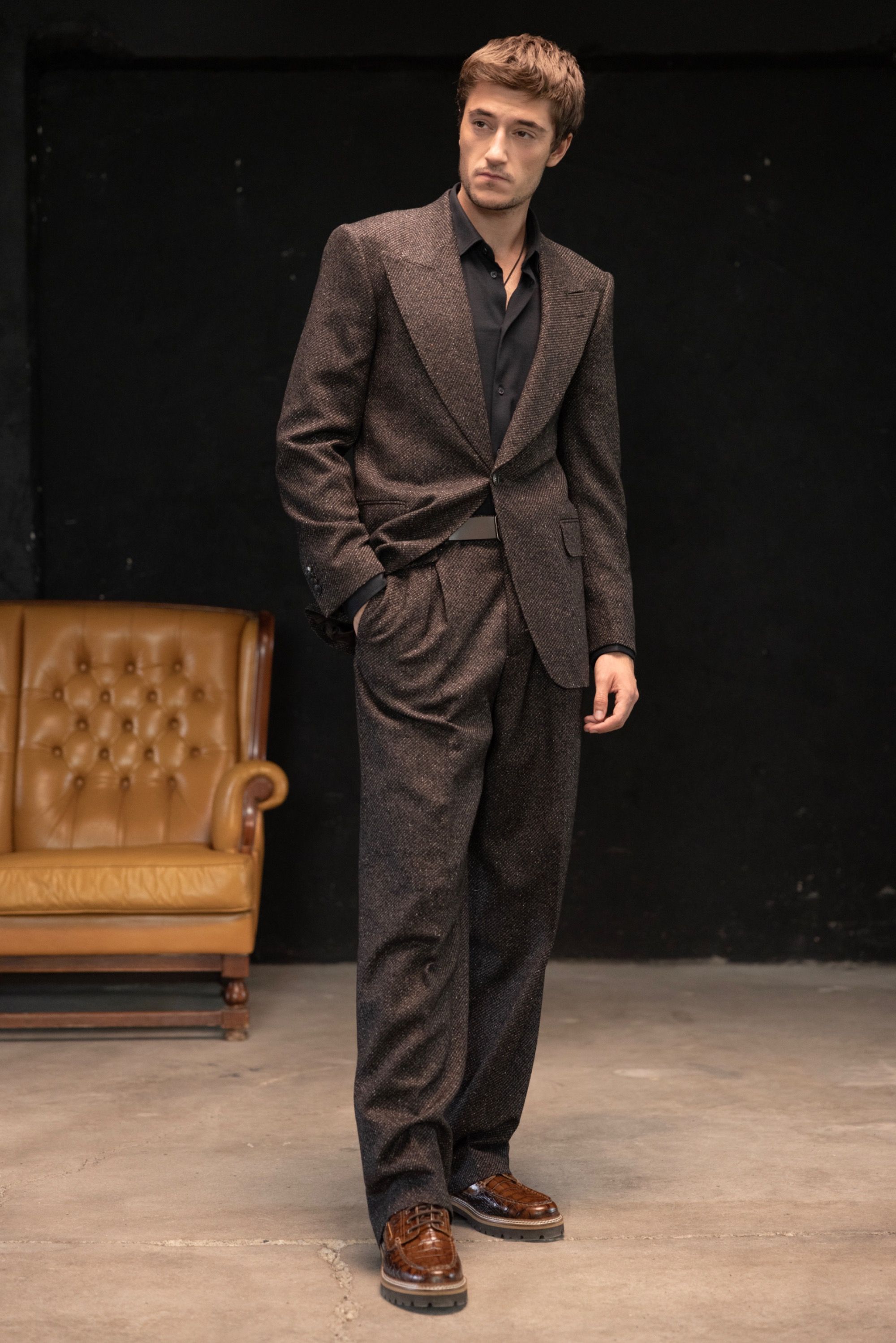 Дизайнерски костюм от вълна и коприна в кафяво черен меланж