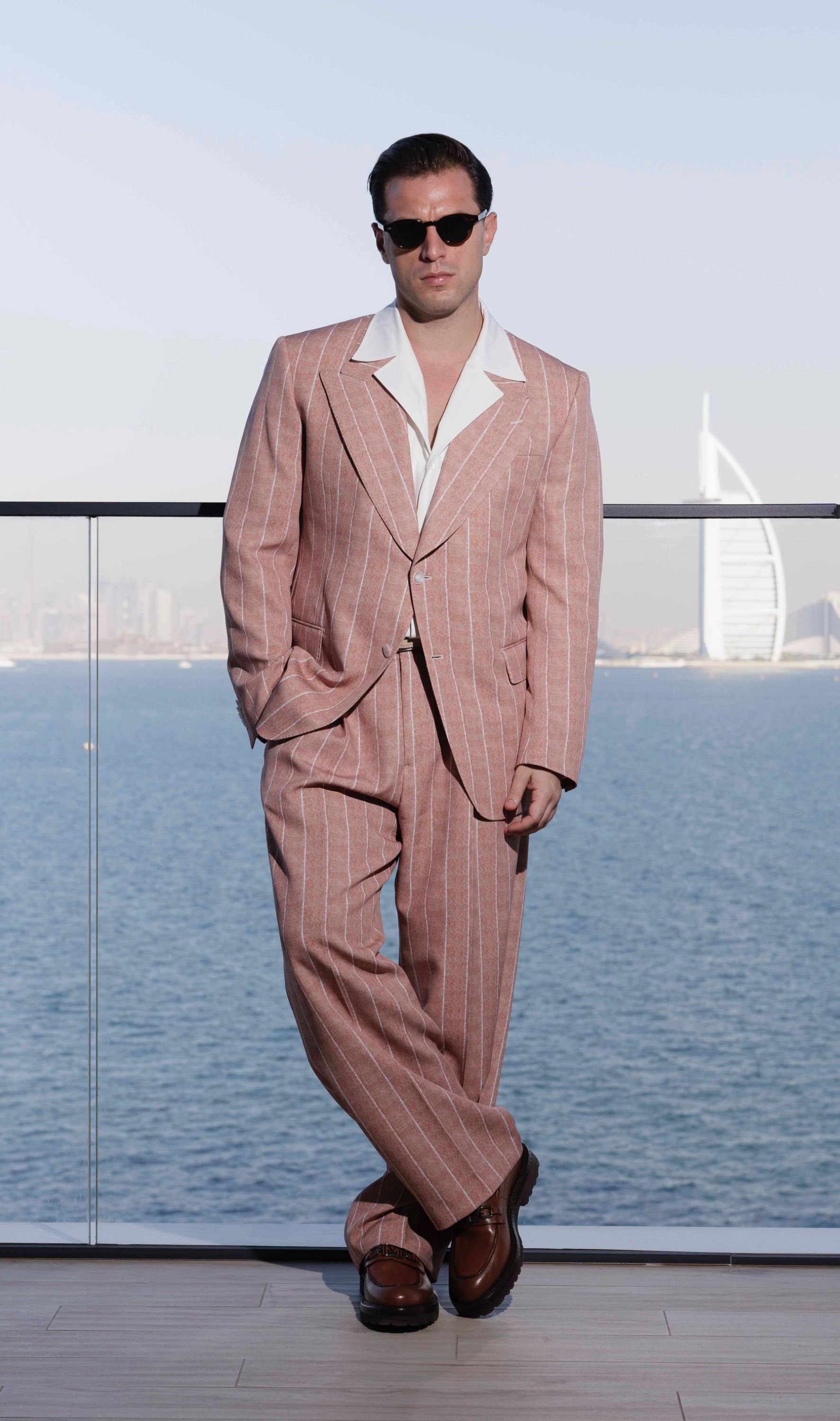 Mъжко луксозно сако с фино райе в цвят сьомга